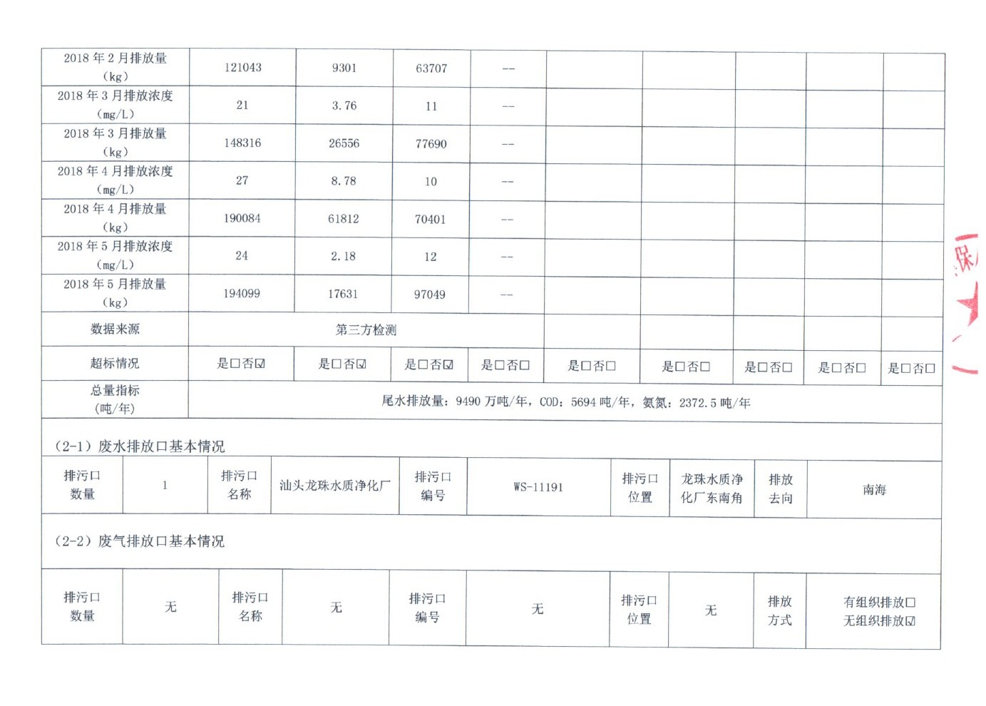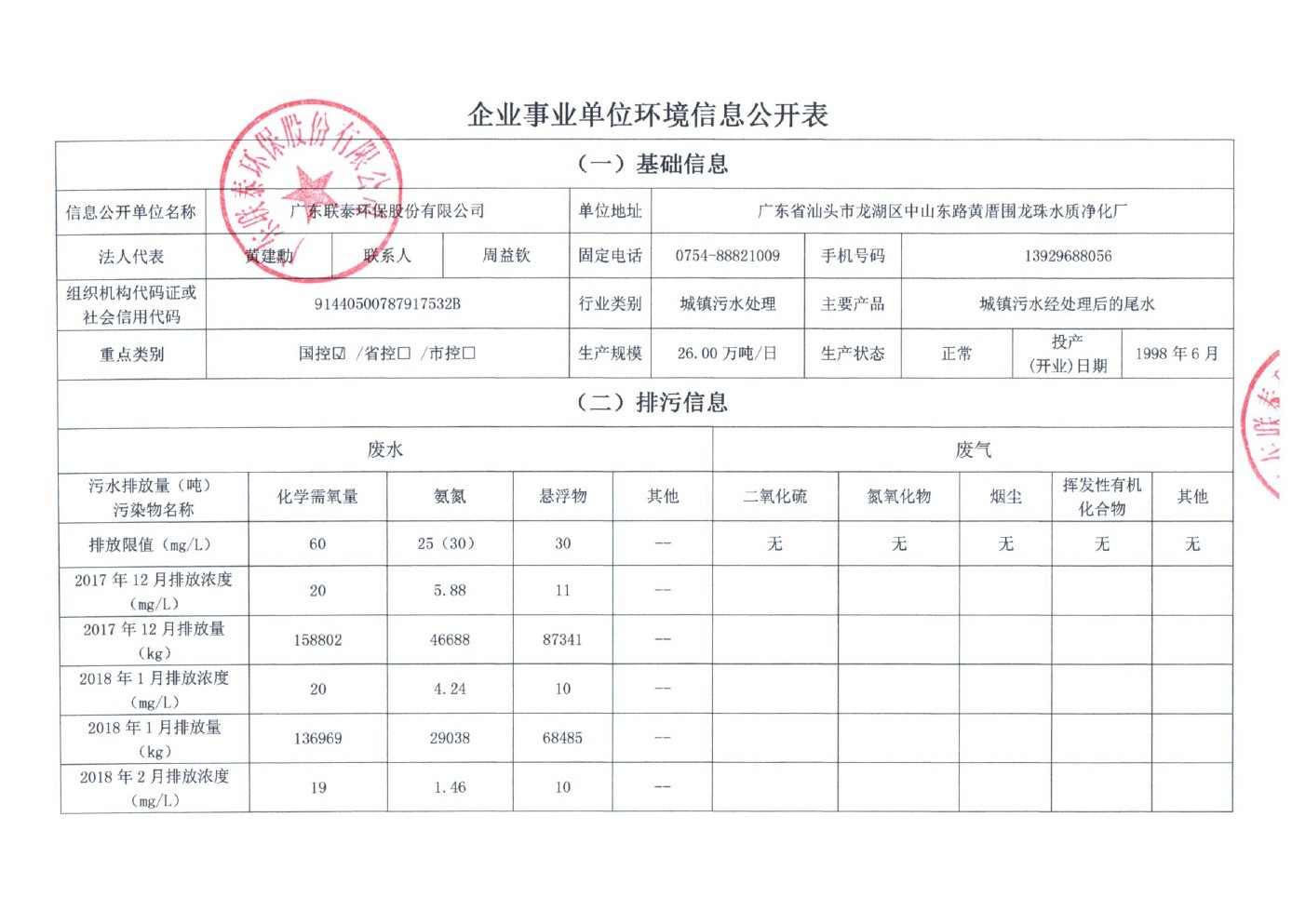 企业事业单位环境信息公开表(龙珠水质净化厂17年12月-18年5月)